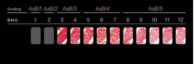日本的牛肉的分级有两个大标准: 1. 成品率等级= 按一头牛身上可食用部分的比例从高到低分为 A、B、C 三个等级 及 2. 肉质等级:对霜降度(B.M.S= Beef Marbling Scale 牛肉中油花的分布)和肉质的细腻程度,颜色、脂肪质量等条件进行综合评价, 并将其归类到5级至1级其中 (五级为最高, 一级为最低). 著名的神户牛排(日本和牛)的等级位于位于 A&B 5-4 档,精品程度极高,如有机会, 饕客们一定要亲自体验一下.