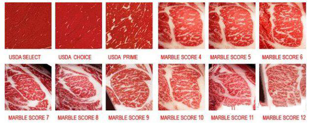 美国牛肉的标准是由农业部(USDA)制定的,标准非常的细致 (例如: 油花分布情况, 或是牛只被屠宰时的年龄状态). 一般来说, 美国牛肉的分级比日本更加复杂,首先它按牛只被屠宰的年龄分成A-E五个等级(A 级一般是 9-30 个月的童子牛,E 级是 72-96 个月的青春期牛). 而第二个标准则是油花(Marbling)分部, 共分为M10-M1,10 个级别. 两个因素综合起来的整体分数直接决定牛肉的级别, 如: 极佳( Prime)、特选(Choice)、可选(Select)、合格(Standard). 以下可做参考.