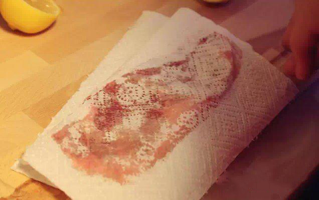 在静置排酸的过程中,牛排会有血水流出 (不要惊讶, 此为正常的状况). 建议您用厨房专用纸巾 (如上图) 将血水吸干, 直至牛排上吸不出水为止.