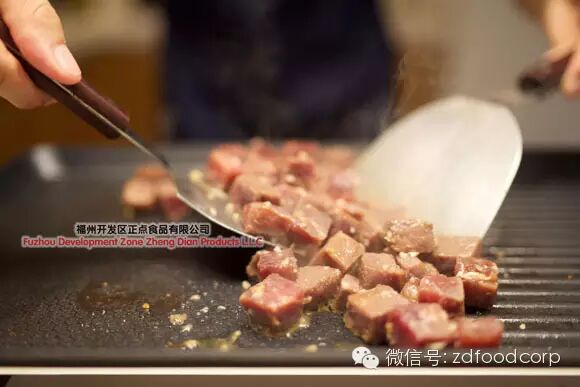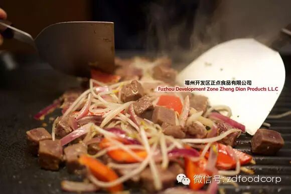 注: 骰子牛肉为正点食品旗下产品之一, 为生腌渍半成品, 使用上等牛肉, 经过独家秘方腌制后速冻制成. 解冻后可以直接快炒或是以烤箱进行熟化.