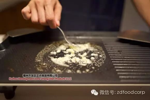 5. 清洗铁板, 再次放入黄油, 及剁碎的大蒜.
